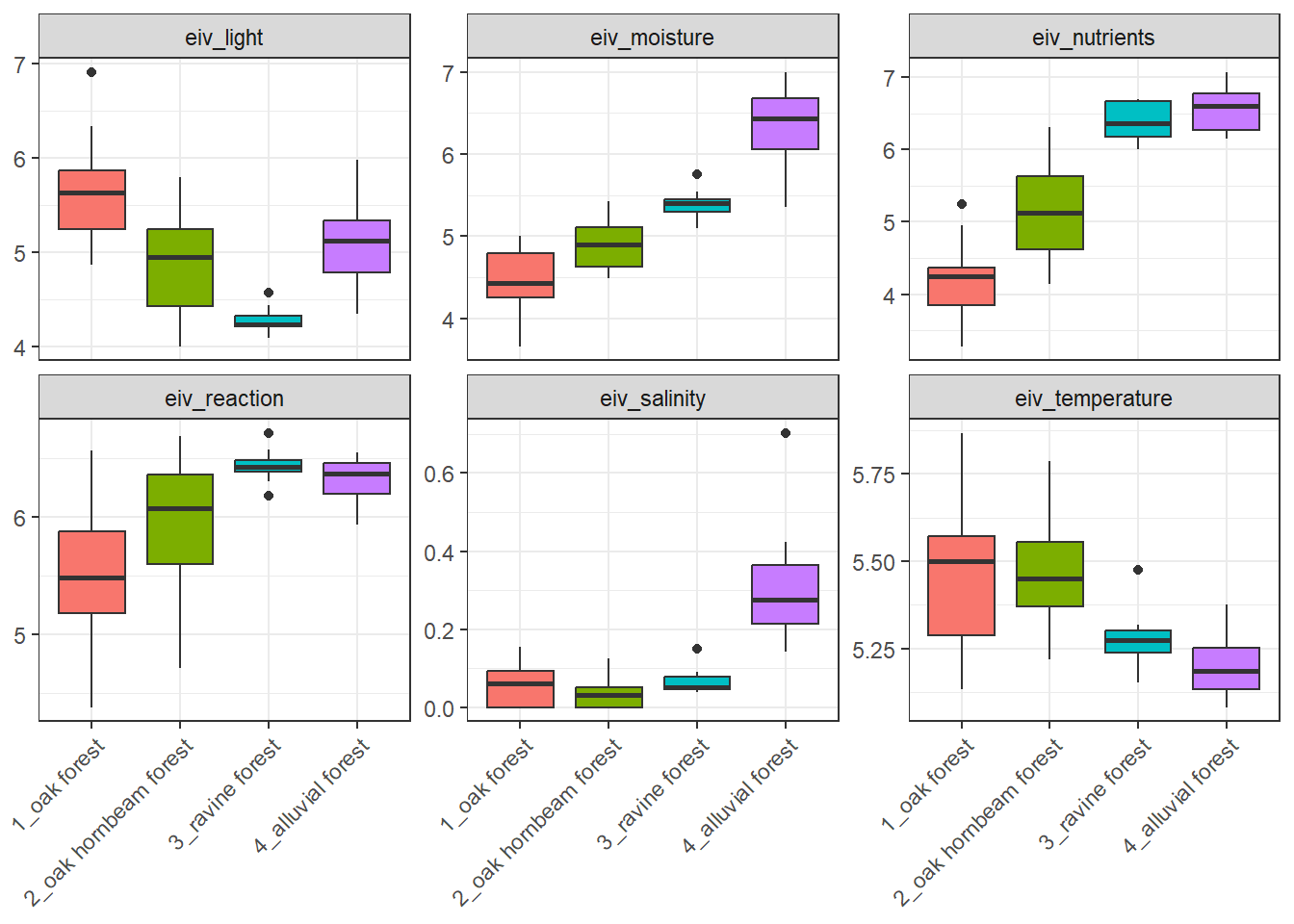 Boxplots of Ellenberg-type indicator values can be produced for example like this: