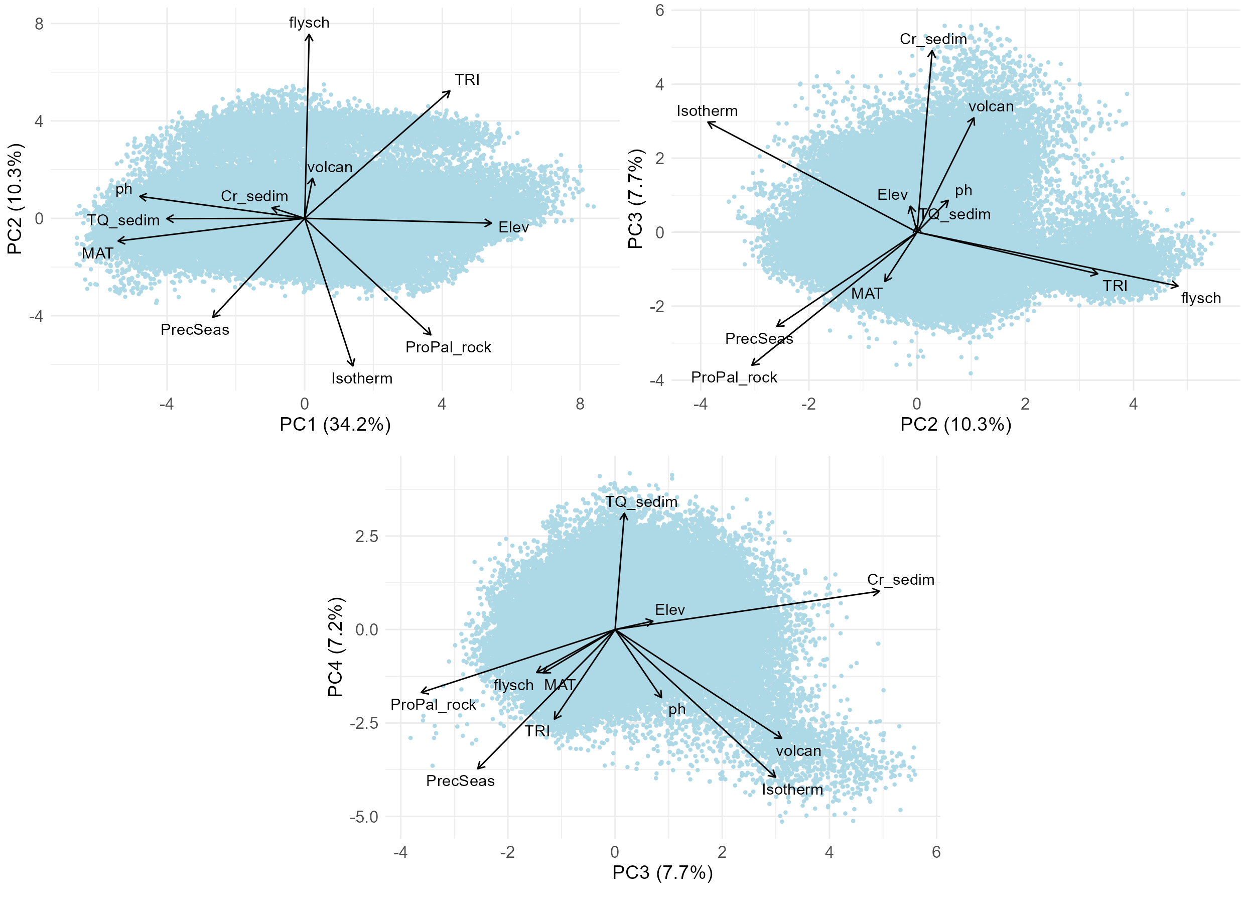 We divided the first four PC axes into equal-sized intervals with a step of 2 SD. Based on each cell’s scores on these axes, grid cells were assigned to the corresponding intervals (denoted by capital letters). Because axes differ in length, they contained different numbers of intervals. The resulting assignment (the stratum) is expressed as, for example, 1F_2C_3D_4E or 1E_2D_3E_4D, where numbers refer to axes (PC1–PC4) and letters to the defined intervals.
