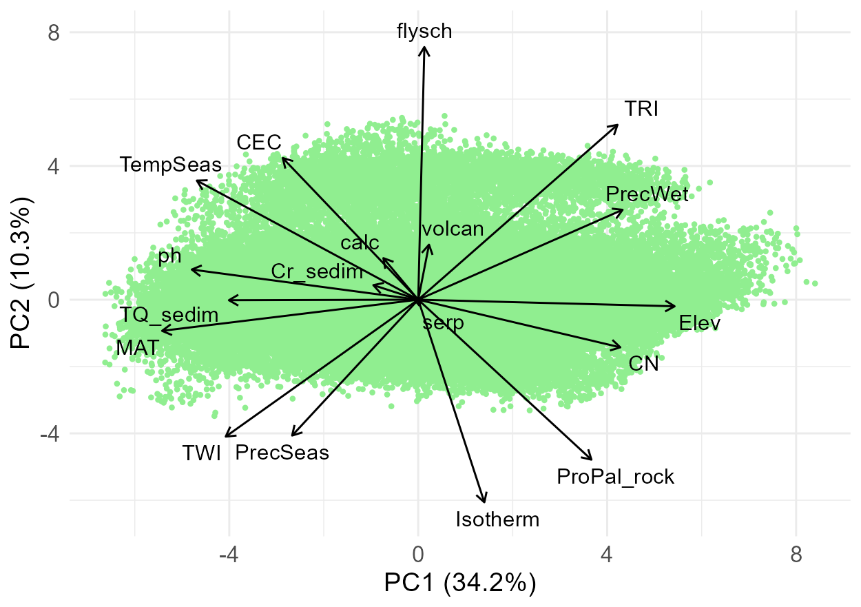Visual inspection of the ordination space – first, including all variables, PC1 and PC2.