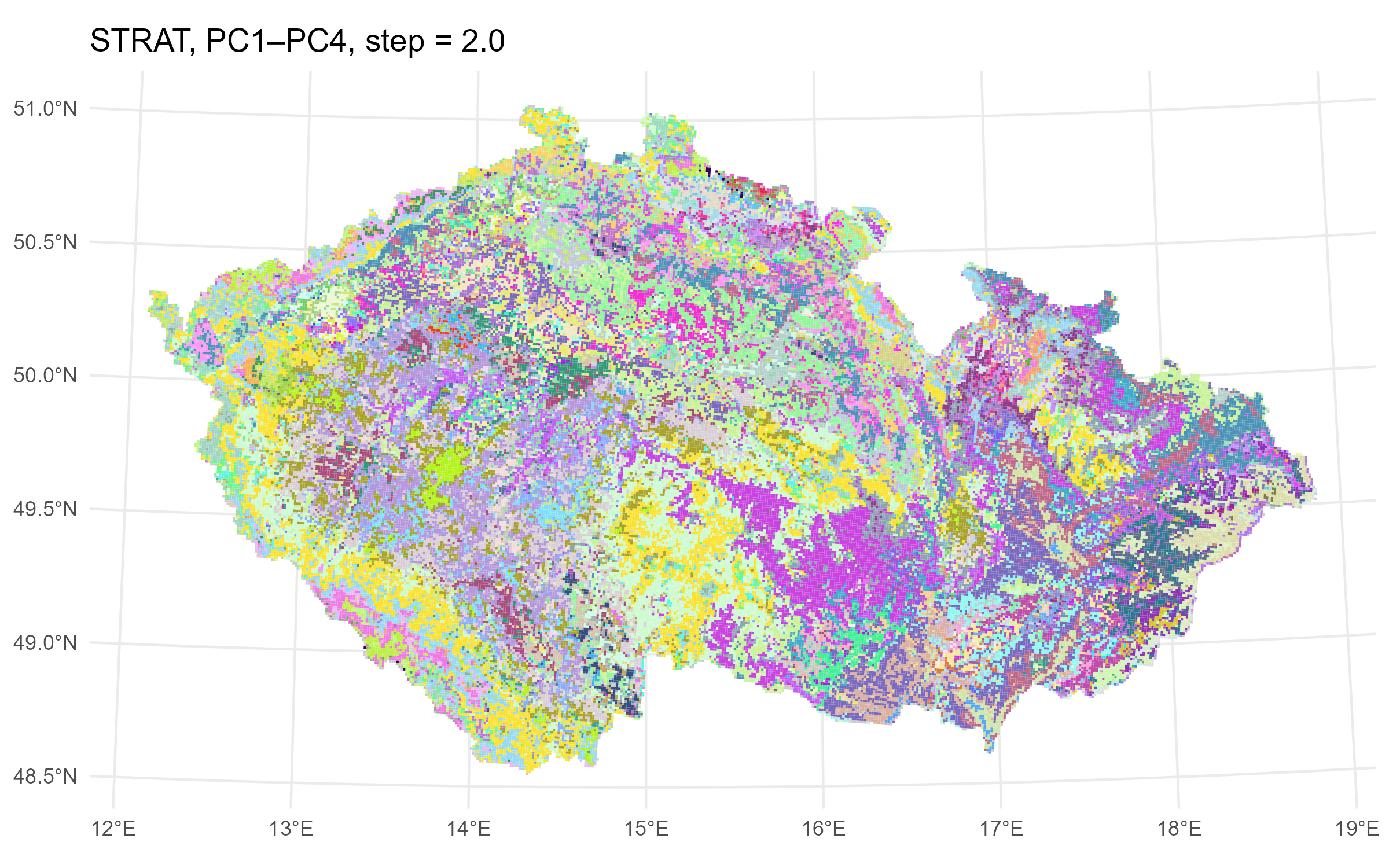 As spatial units for the environmental strata, we used the 1 km EEA reference grid for the Czech Republic. Each 1 km grid cell was assigned to a stratum based on a combination of environmental variables using principal component analysis (PCA). We then assigned each vegetation plot (N = 116,148) to a stratum based on the grid cell in which it was located. This assignment was subsequently used as one of the criteria in the resampling procedure (described here) to prepare a spatially and environmentally balanced, publicly available subset of the Czech Vegetation Database.