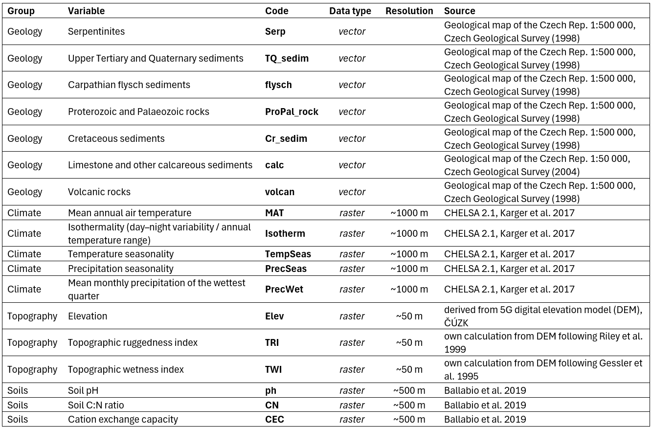 These variables were selected based on a preliminary PCA of climate variables, correlation analysis (omitting highly correlated variables), and expert knowledge. Soil rasters from LUCAS contained NoData pixels in some areas across the Czech Republic (typically urban agglomerations or regions with a high density of water bodies); these missing values were interpolated from surrounding cells using a nearest‑neighbour algorithm in ArcGIS Pro.