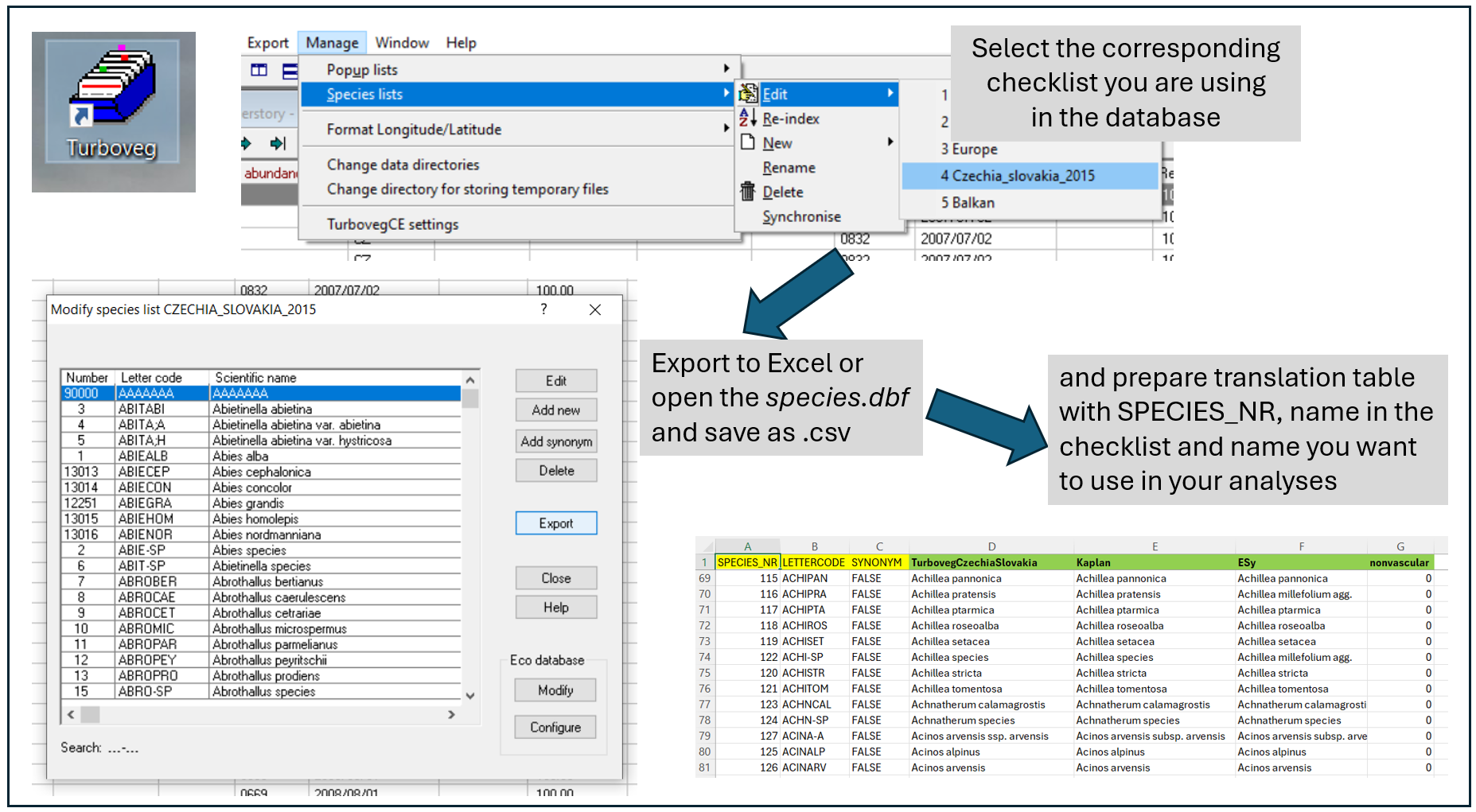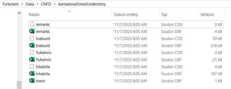 Turboveg for Windows is a program designed for the storage, selection, and export of vegetation plot data (relevés). The data are divided among several files that are matched by either species ID or relevé ID. You do not see this structure directly in the Turboveg interface, but you can find it in the Turbowin folder, subfolder data and particular database (see example below).